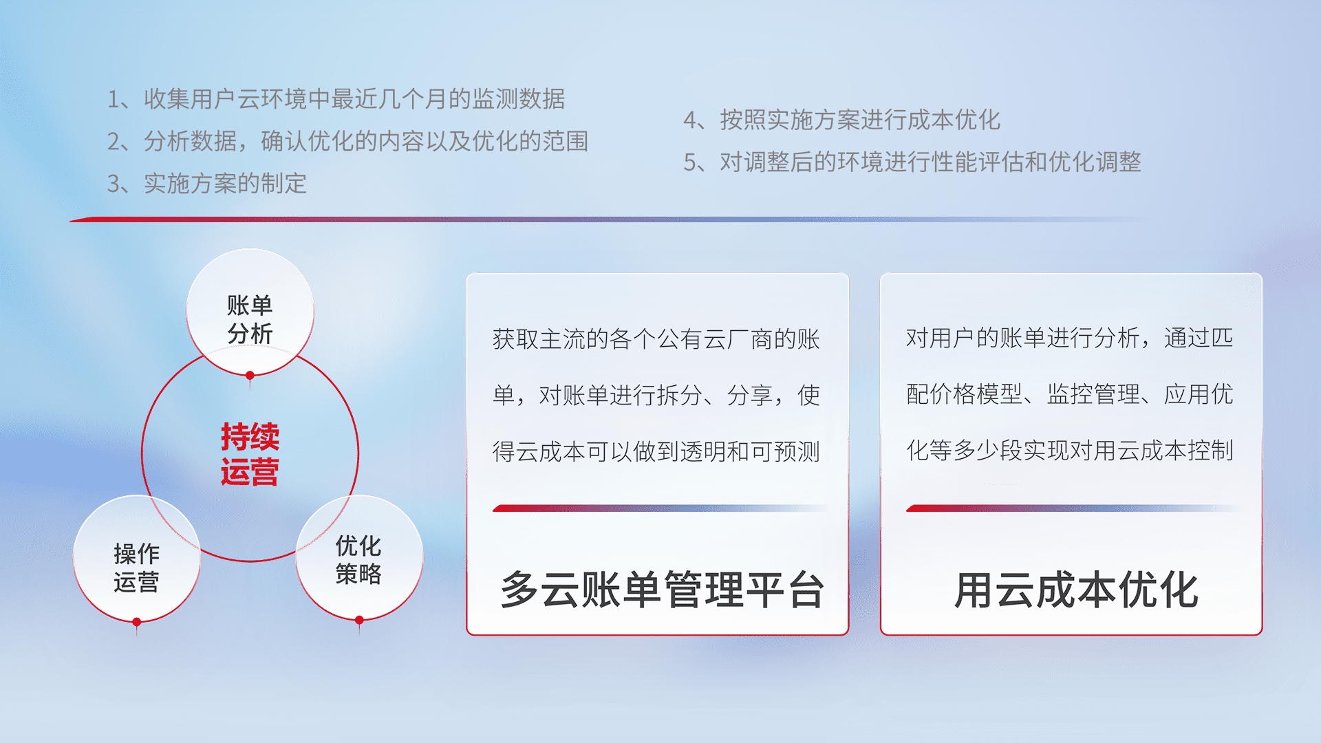 通过多云纳管,,以统一的资源数据模型把客户的云资源进行抽象和封装,,,进而实现对多云资源的统一操作,,,,保障云资源管理的可靠性、、、、稳定性与可用性。。。量身定制化运维内容,,,配置、、开发运维、、、补丁管理、、备份、、、监控、、、认证和访问管理、、、、审计和日常巡检等,,,,保障在用云过程中的可靠度,,,稳定度以及高可用率。。。